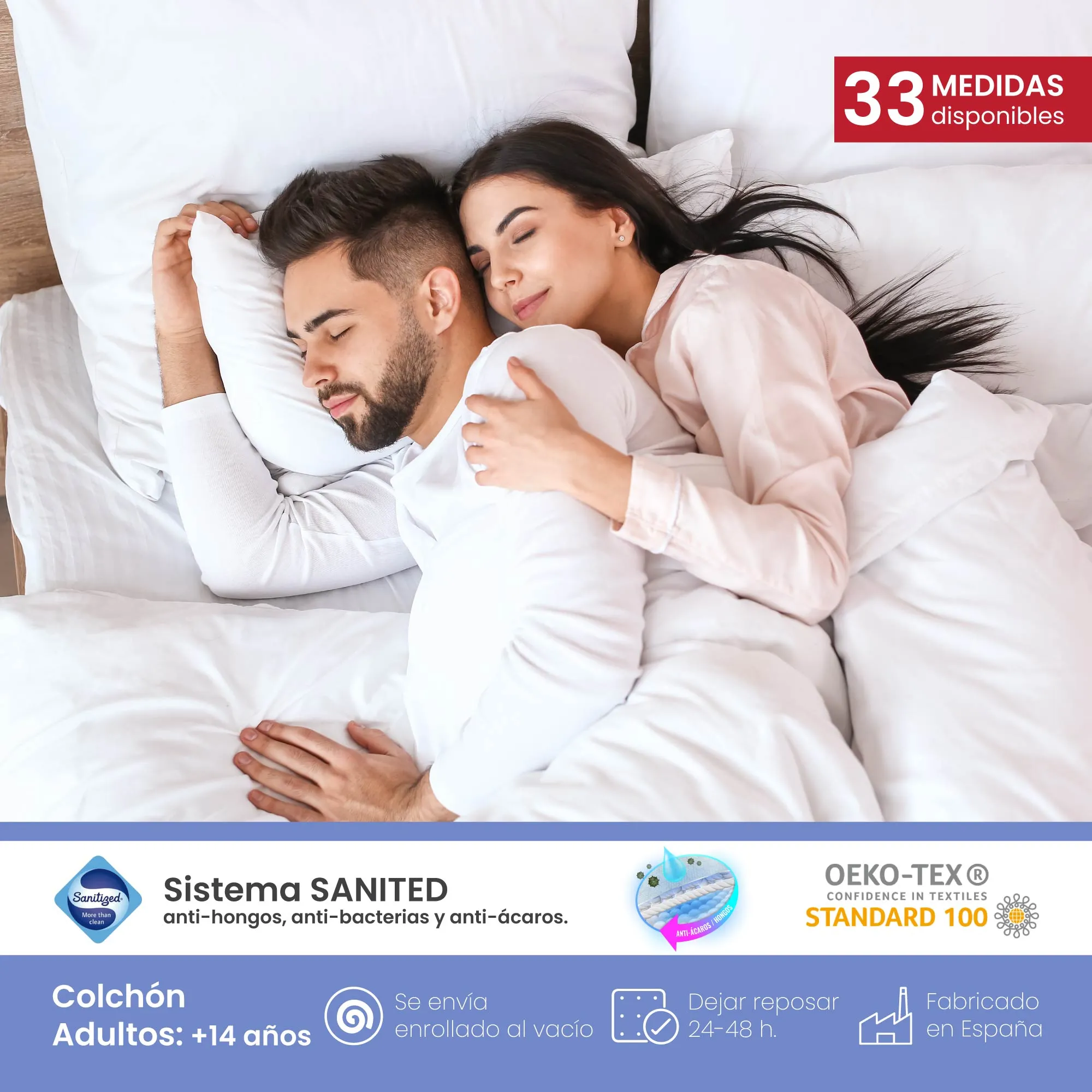 El sistema de muelles ensacados independientes favorece la independencia de lechos y una adaptación precisa a cada zona del cuerpo. Además, el refuerzo perimetral mejora la estabilidad lateral, evita hundimientos en los bordes y permite aprovechar toda la superficie útil del colchón, garantizando un descanso duradero y estable con el paso del tiempo.